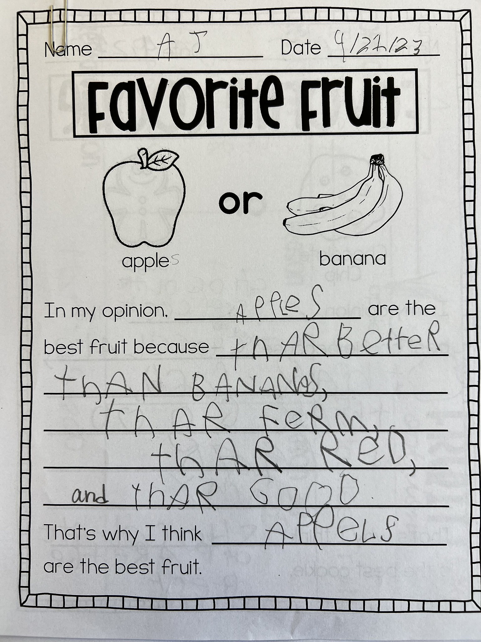Children in Kindergarten and First Grade participated in a writing class this spring where they “played” with words and pictures. They worked on rhyming, fact & opinion and writing descriptive sentences. Here are some examples of their writing.