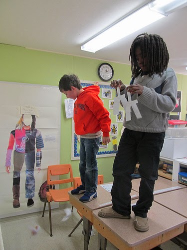 Muta, Mae, Syris, Greer, Noah, Lola and Moebius took part in the Bugsocopters science unit. Bugscopters are a t-shaped, paper, helicopter-like creation of Larry Schafer, formerly professor of Science Teaching at SU. The students completed six experiments in which they compared their standard bugsocopter to another that varied in just one way. Each experiment consisted of two tests. The first test was comparing if the varied bugsocopter fell faster, slower or the same as the standard bugsocopter and the second test was comparing if the twirling was faster, slower or the same. Each student stood on a desk to drop their two bugsocopters and carefully observed the falling and twirling. These experiments gave students the opportunity to graph their data on histograms, gather data as a class, interpret and compare data, make careful observations, define and understand variables and recognize the importance of limiting the variables to just one in an experiment.