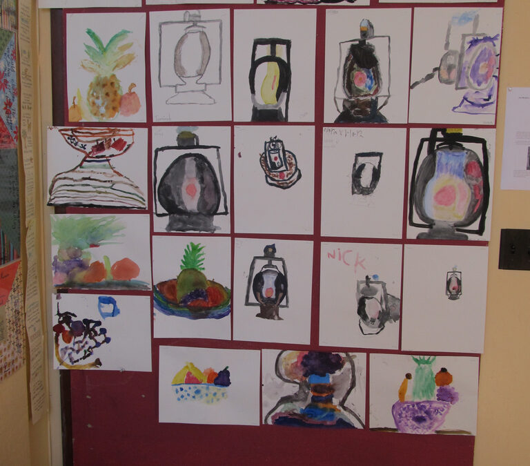 Already inspired, the students were drawn to the old lantern that Joe illuminated from behind, in red. He pointed out the varying light, shadow, reflections and colors on the black metal and glass object (or, the following day for a second group, on the colorful fruits and vegetables before them) then demonstrated dry (moist brush to paint to paper) and wet (water to paper, moist brush to paint to wet paper) techniques, which the children used in their own wonderful paintings.