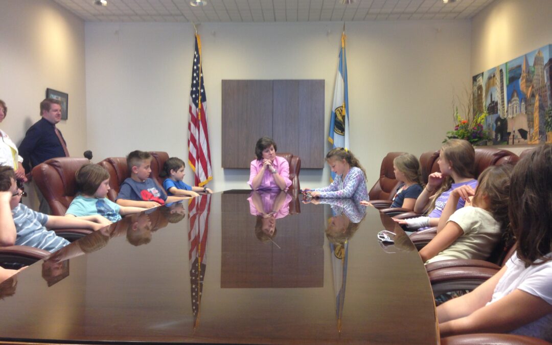 On June 4th, the older students went on their final “Government” field trip to learn about Syracuse’s Executive Branch. Thanks to Alexander Marion, we were invited into Mayor Stephanie Miner’s conference room where the children spent 45 minutes asking her questions. The children were so impressed by Syracuse’s first woman mayor, and by her conference room chairs! Then she took us into her office andoffered to have her picture taken with each and every student sitting at her desk! After being ushered out Mayor Miner’s “secret” second door Alexander gave us a tour of the building, climbing 4 four floors, learning about the history of the building every step of the way!