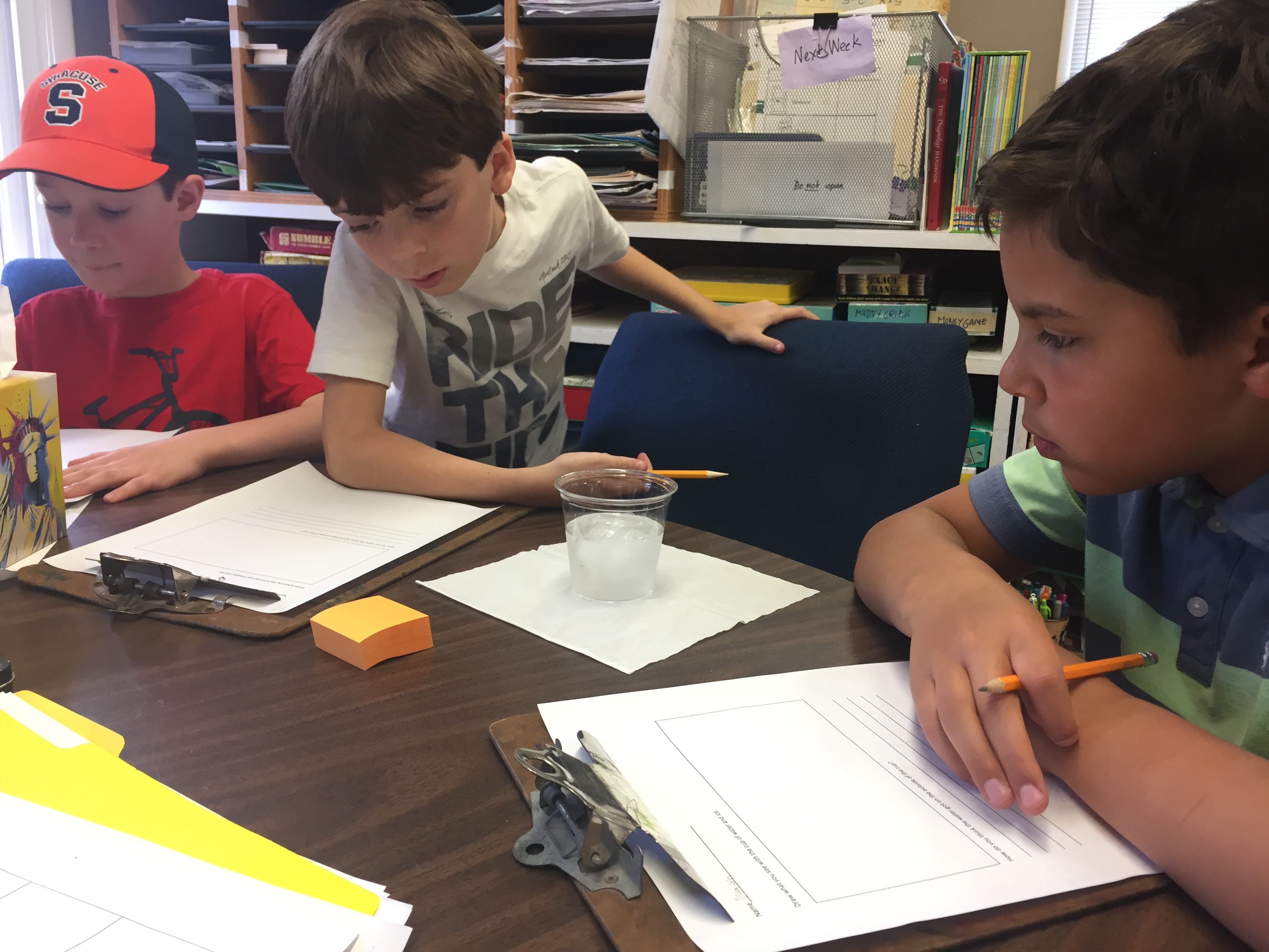In our science class with students in grades 3 and 4, we studied the water cycle. This unit focuses on how water exists in our world and how it transforms from phase to phase.We explored how water exists in nature as a solid, a liquid and a gas. In this unit we have read two books that explain the journey of a water droplet as it travels through the environment. We observed a demonstration on condensation by heating water in a frying pan and watching what happened on a cookie sheet above.