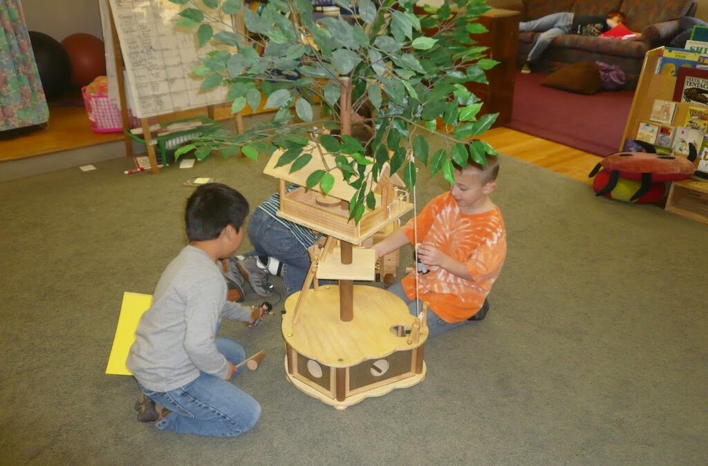 Every day kindergartners and first graders enjoy opportunities for creative play. In small groups of three or four, as they play with blocks, cars, geotracks and marble runs, they learn how to collaborate, share ideas, and negotiate with each other. The children have also collaboratively designed a landscape of popcorn kernels, rocks, and twigs, explored seashells and a variety of sea creatures in the ‘water table’ and most recently playing with our “Tree House” has encouraged rich conversation about the rain forest as tree frogs and insects jump from layer to layer !
