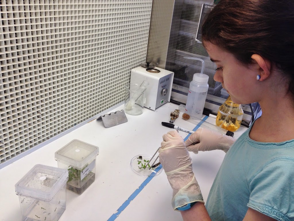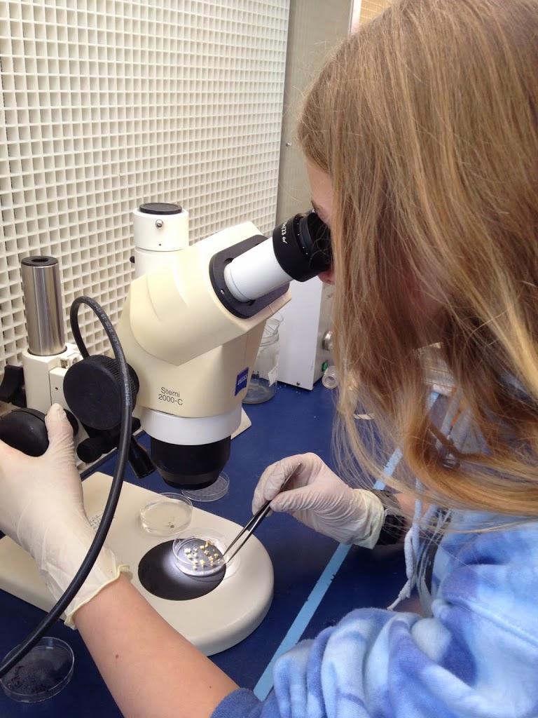 Then Linda gave us some hands on things to do. She showed us how to take embryos off calluses and how to take a callus off of the bottom of a plant. When we were working on the embryos we had to work under a microscope, that is partly what made the task hard to do. Taking the embryos off was difficult because they are so small it’s very hard to pluck them off. The shoots were easier because all we had to do was cut the leaves off and cut the shoot into three pieces to put into tissue culture to grow more trees. Doing this is part of Linda’s job. She has to do this because if she didn’t the trees would die.After we were done with those tasks we went down to Marina’s Dad’s (John) lab. John’s lab was different than Linda’s. They both study trees but John studies the tree when it’s older and looks at the rings of the trees. He also goes to different places and sees where the trees were most prominent. It was very exciting. We got to look at the rings of trees and he showed us how to take a part of the tree without cutting it down. He