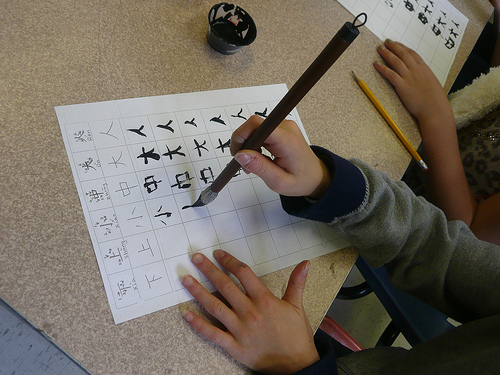 On Thursday, October 28, 2010 we were hosts to our first Mystery Guest of the year. Our thirty students had three minutes to find out why Emily was at our school. In those three minutes they could only ask Emily yes or no questions. Our students quickly guessed Emily was with us to teach us about China so then they tried to narrow down the focus of her visit. They asked, “Are you here to teach us about the Great Wall?” “Are you here to teach us about Chinese culture?” After the three minutes were up, Emily shared an informative power point presentation on life in China, its history and its culture. Following the whole group presentation Emily taught two smaller groups of students the art of Chinese calligraphy.  It’s trickier than it looks to hold the brush the correct way and to keep the point on the tip of your brush!