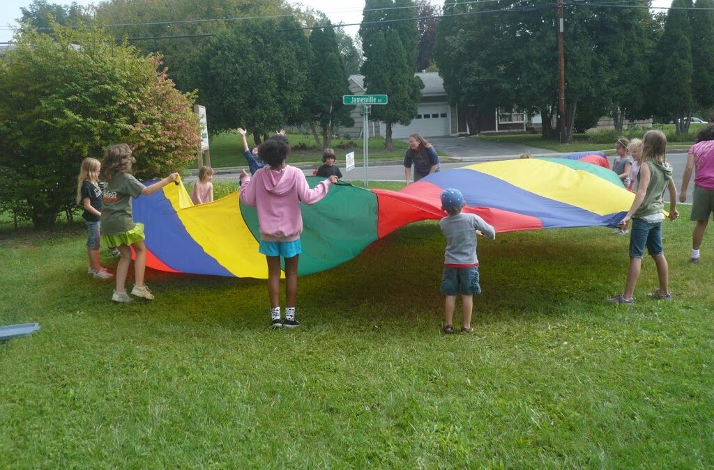 Gym time is an active time. We play lots of different games and split into all different types of groups. On this day, we had multi-age groups. One group played a tag game while the second group enjoyed playing with the parachute. We encourage kids to play safe, fair and hard in every type of gym game we play. We always start gym games with a talk about what we’re playing and end each game with a circle where we can discuss the positive parts of the game and the parts that we could improve upon the next time we play.
