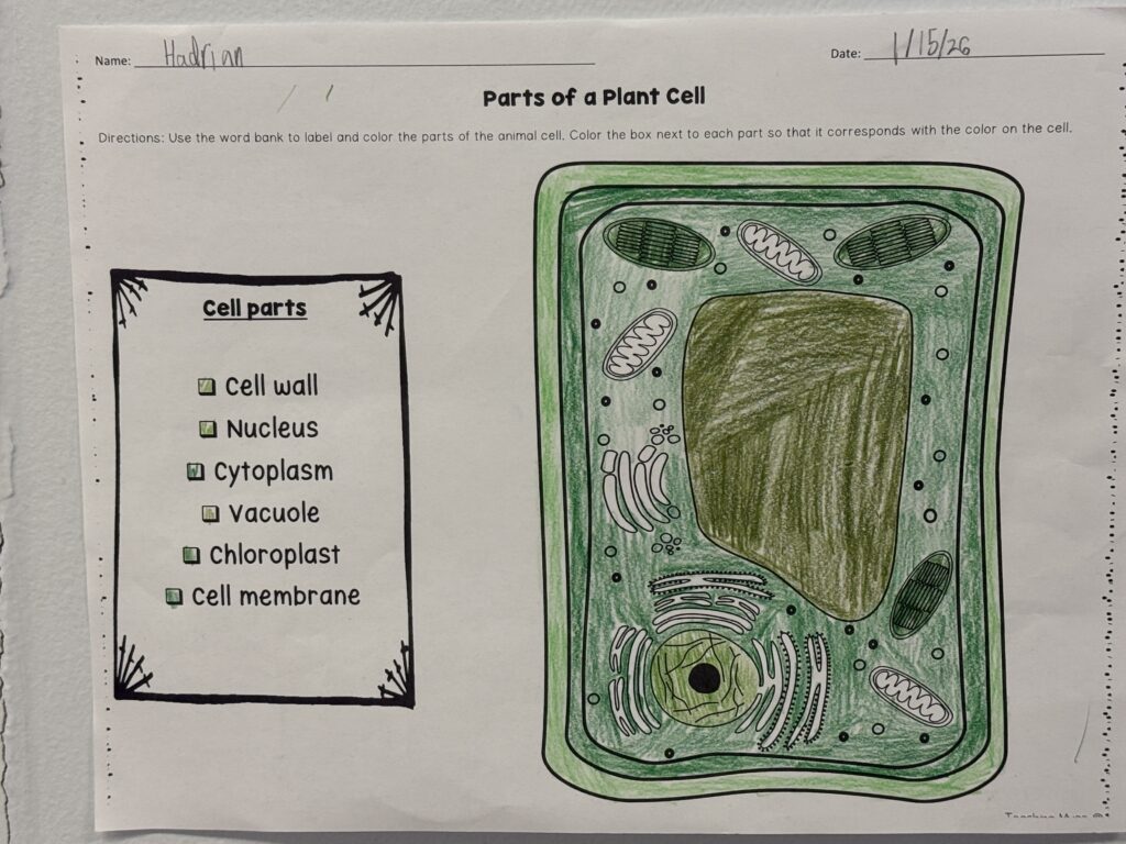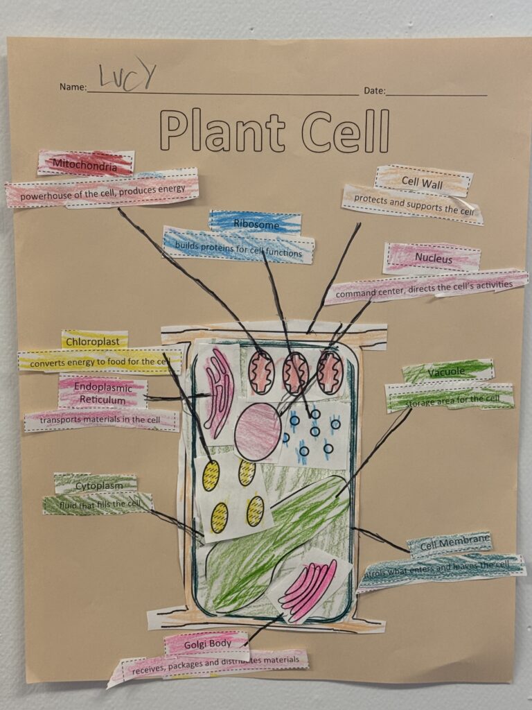 This winter and spring of 2026, students in grades 6th, 7th and 8th have been learning about plant and animal cells. We started our cellular exploration by looking at many parts of the cell and learning about the most important parts that help the cell function. Students identified and labeled parts of the plant cell including: ribosomes, nucleus, cell membrane, central vacuole, mitochondria, chloroplasts, endoplasmic reticulum, Golgi body, cytoplasm and cell wall.