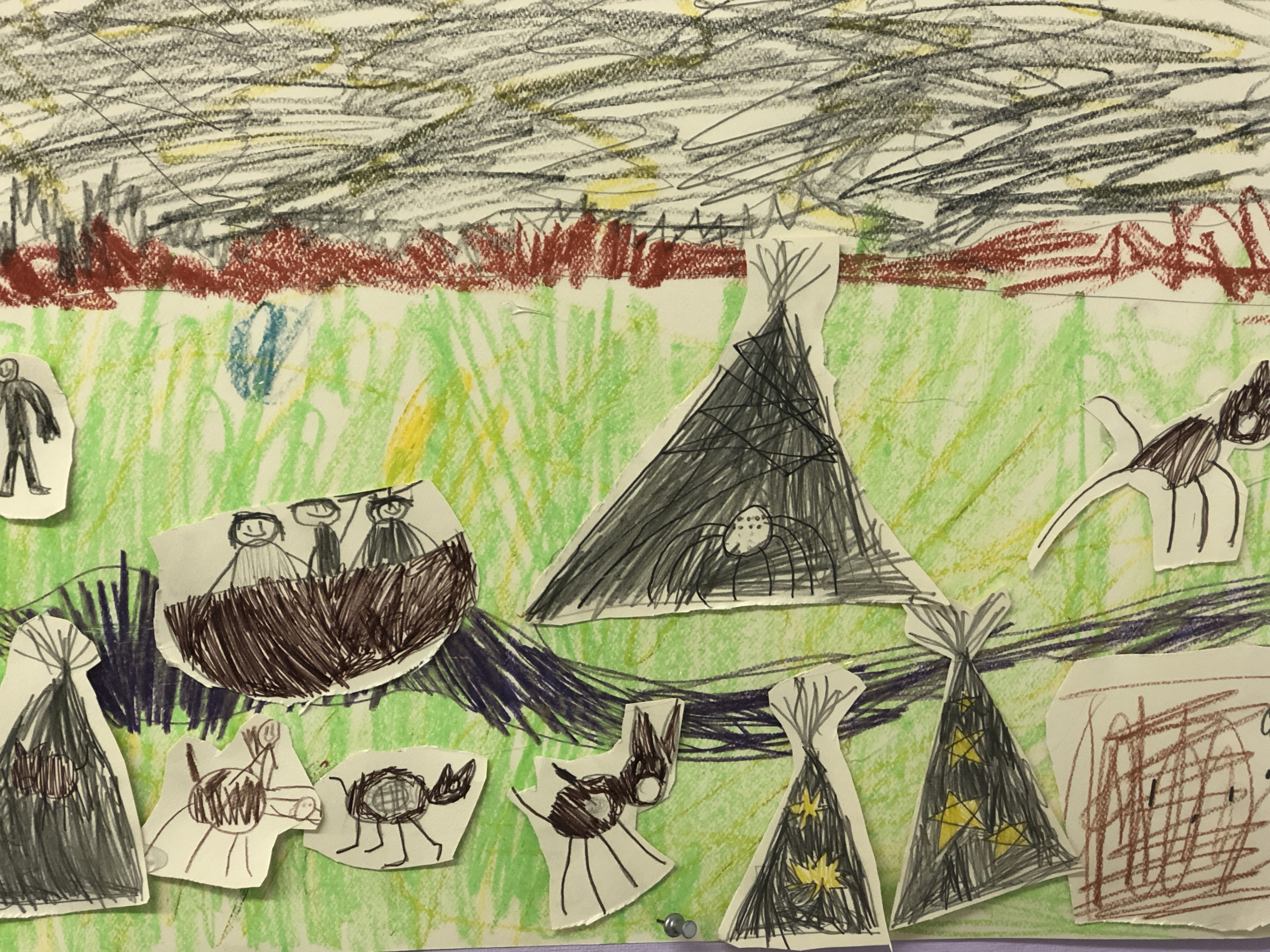 To start off our unit on native tribes in the US, we studied maps and discussed how the original inhabitants of North and South America came to the continents over the ice covered Bering Strait. We looked at the tribes in the 5 regions, (north east, south east, north west, southwest and plains) and how they had different homes and ways of life. We soon learned how the culture of each tribe is affected by the geography of the land where they live. Their local resources determined the types of homes they lived in and whether they were nomadic or settled. Using Visual Thinking Strategies (VTS), students responded to images showing Native American culture. Each student was assigned a different tribe to research. We read books and watched videos to learn more about each tribe. Children created a large illustration of their tribe’s landscape and then added illustrations of their homes, and many aspects of their lifestyle. To complete their research students will be writing a paragraph about their tribes.