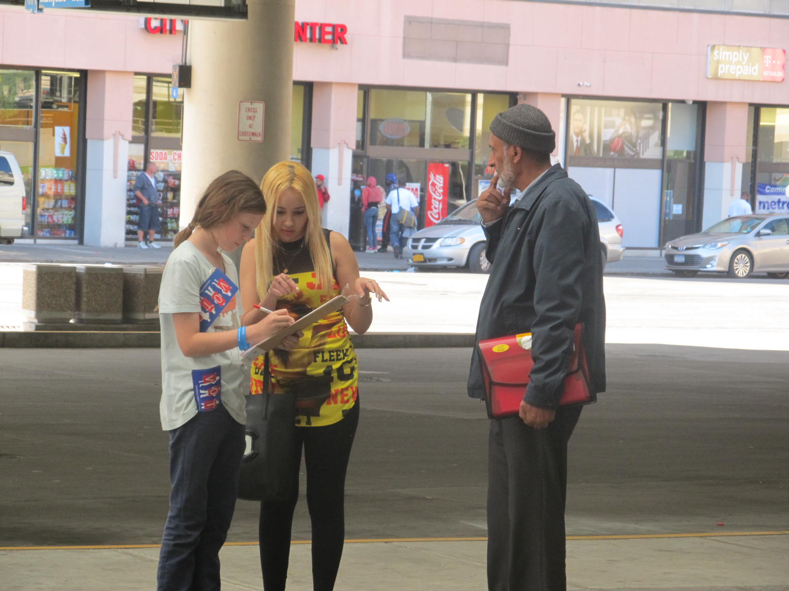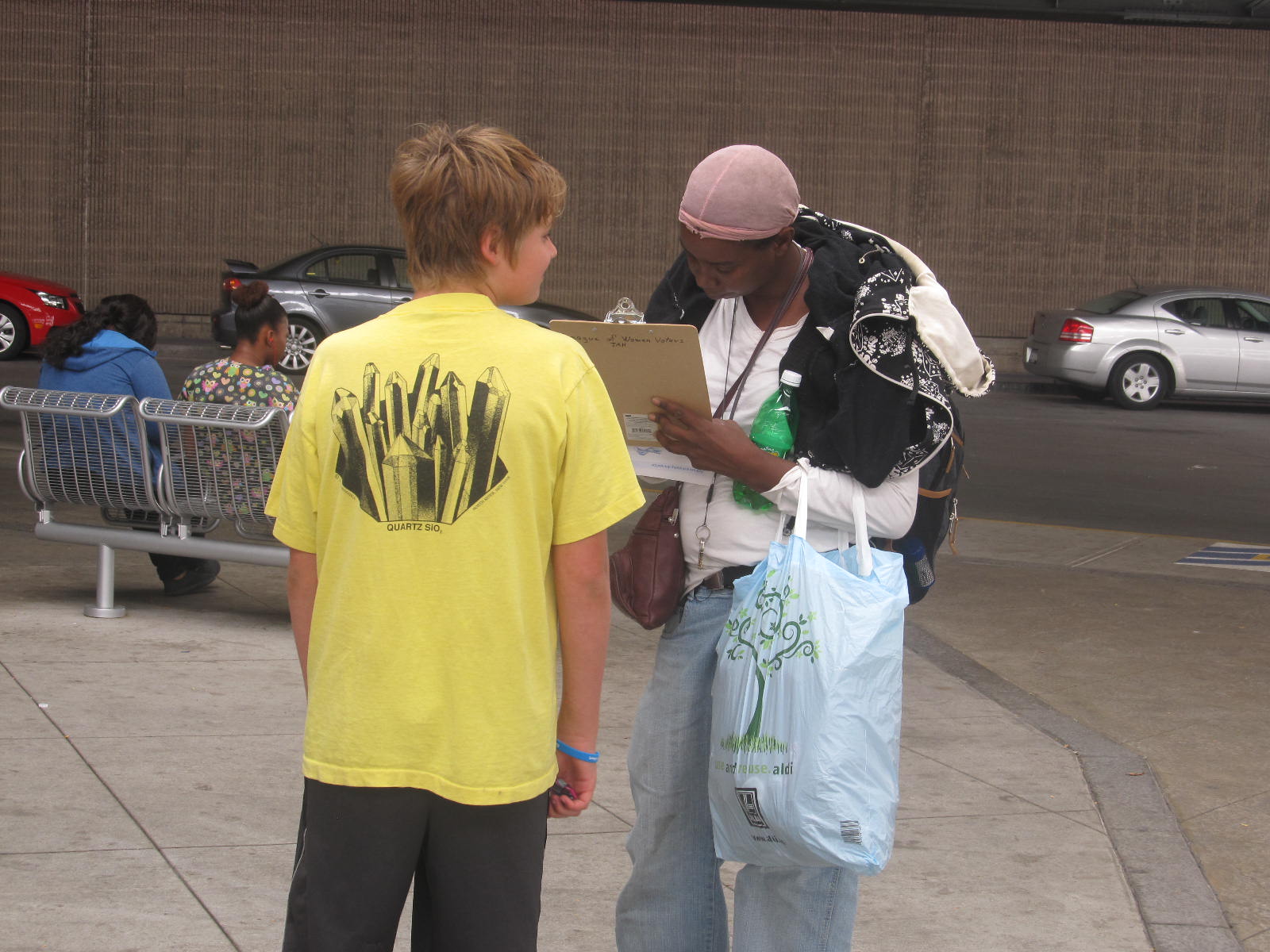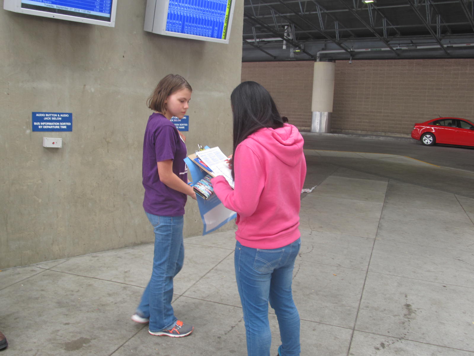 The five oldest students volunteered to help the League of Women Voters in a voter registration drive at the downtown Centro bus hub. After a brief orientation, the children clutching clip boards, registration forms, buttons, and voter registration identification badges were encouraged to approach individuals waiting for a bus and ask them, “Are you a registered voter?” This sounds simple, but it took a lot for twelve and thirteen year olds to complete such a simple task. And then they had to be ready to respond to the answer given. The children all agreed that the first attempt was the hardest but with practice it became incredibly satisfying.